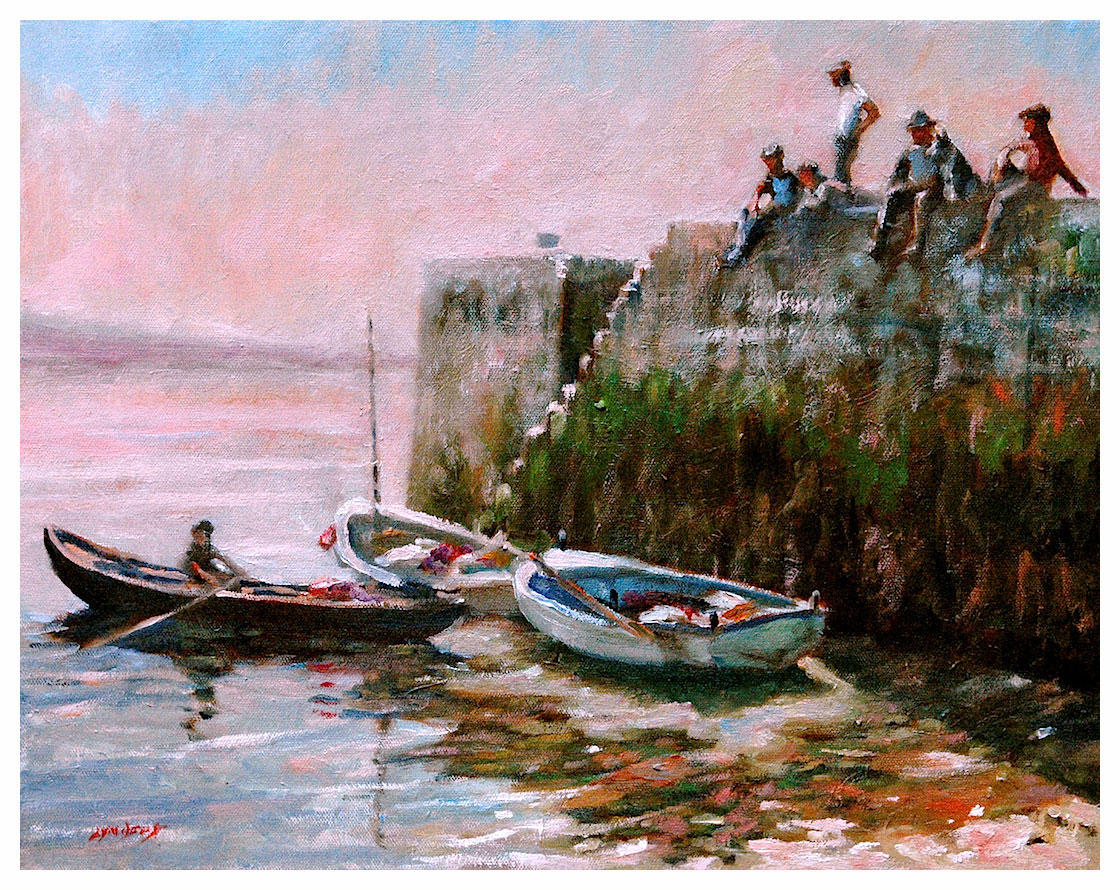 The original harbour wall, a place for the Island men, boys and dogs to meet . |